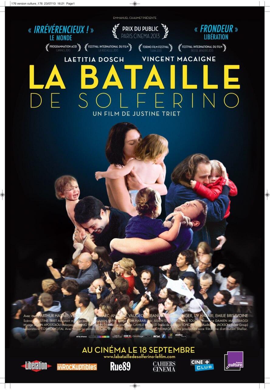 La Bataille de Solferino France, 2013 De Justine Triet Avec Laetitia Dosch, Vincent Macaigne, Arthur Harari 6 mai 2012, Solférino. Laetitia, journaliste télé, couvre les présidentielles. Mais débarque Vincent, l'ex, pour voir leurs filles. Gamines déchaînées, baby-sitter submergé, amant vaguement incrust, avocat misanthrope, France coupée en deux : c’est dimanche, tout s'emmêle, rien ne va plus ! |